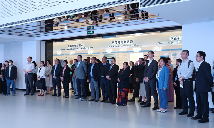在中新物流園,使節(jié)團(tuán)通過參觀展廳、聽取介紹、互動交流等方式詳細(xì)了解園區(qū)的發(fā)展情況,對西部陸海新通道的戰(zhàn)略地位與廣西在其中的作用有了更深的認(rèn)識。中新物流園是廣西參與“一帶一路”及推進(jìn)中國與新加坡互聯(lián)互通、西部陸海新通道建設(shè)、海洋經(jīng)濟(jì)發(fā)展的重大項目之一,自2018年10月開工建設(shè)以來,園區(qū)發(fā)展迅猛,產(chǎn)業(yè)集聚效應(yīng)加速顯現(xiàn),現(xiàn)已引進(jìn)超30家世界500強(qiáng)和中國100強(qiáng)龍頭企業(yè)進(jìn)行合作,共同實施項目建設(shè)與運營。