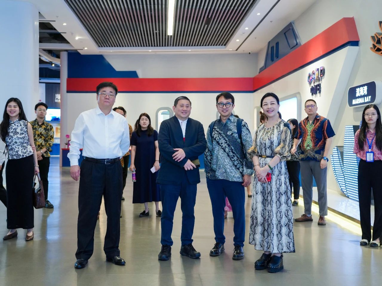 步入?yún)R聚中心,陳海泉大使便被新加坡展館門口的魚尾獅所吸引,特意駐足拍攝。進(jìn)入展館后,考察組沉浸式體驗(yàn)了璀璨星空走廊、垂直綠化的花園城市與組屋街區(qū)等場景,紛紛表示很開心能在廣西看到一個(gè)多維度呈現(xiàn)“獅城”獨(dú)特風(fēng)貌的地方,漫步其中恍若回到新加坡,倍感親切。同時(shí),考察組充分認(rèn)可了匯聚中心線上線下相結(jié)合的創(chuàng)新理念,并就未來在經(jīng)貿(mào)、物流等領(lǐng)域的合作與匯聚中心團(tuán)隊(duì)進(jìn)行了交流并達(dá)成共識(shí)。