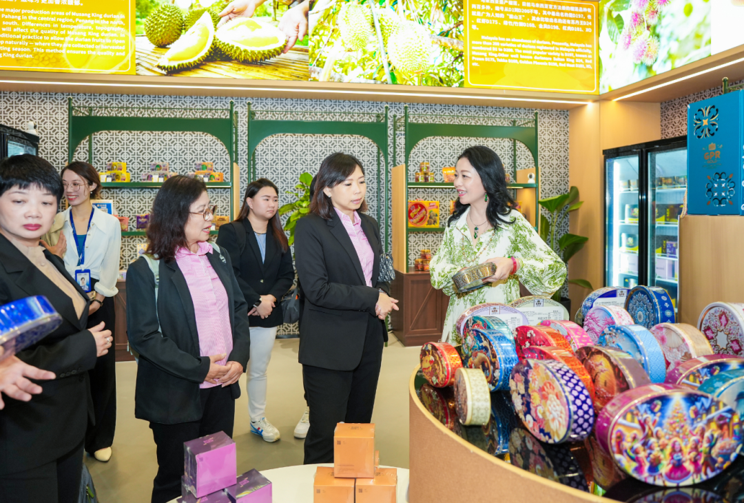 來(lái)到馬來(lái)西亞館,各類富有當(dāng)?shù)靥厣娜宋娘L(fēng)俗與“僑元素”生動(dòng)呈現(xiàn):從標(biāo)志性的雙子塔、五大經(jīng)濟(jì)走廊,到傳統(tǒng)巴迪布、高腳屋和榴蓮樹(shù)造景,無(wú)不喚起代表團(tuán)的熟悉與親切之感。館內(nèi)還陳列了燕窩、巧克力、白咖啡等特色商品,進(jìn)一步增強(qiáng)了實(shí)地體驗(yàn)的氛圍。大家紛紛就館內(nèi)已入駐商品的運(yùn)營(yíng)推廣情況,進(jìn)行詳細(xì)的了解和探討。在得知各館均有相應(yīng)館長(zhǎng)對(duì)商品進(jìn)行管理與推介時(shí),代表團(tuán)更是稱贊連連。