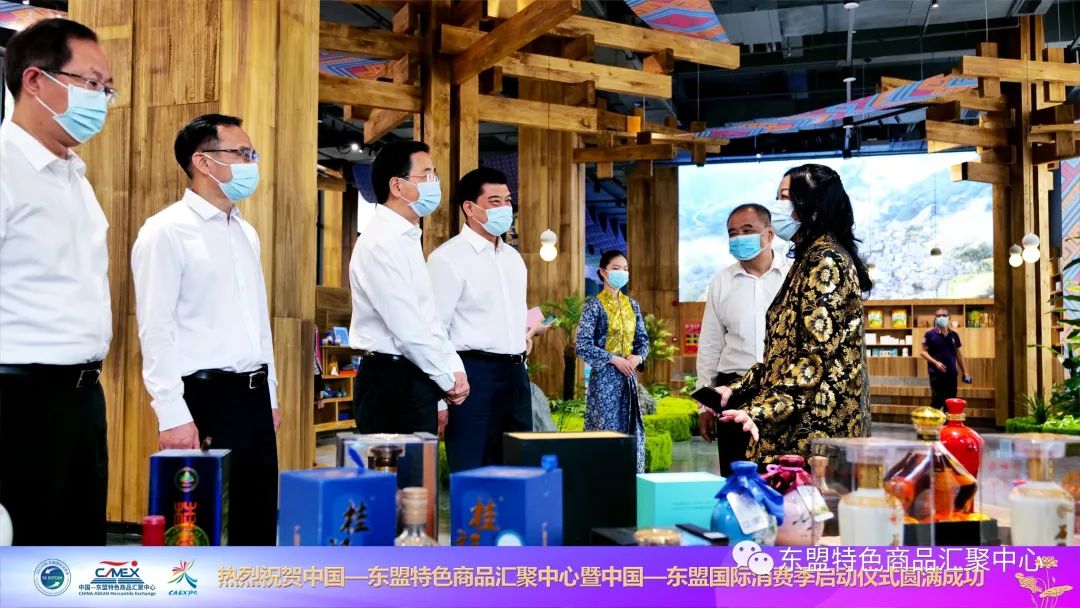 啟動(dòng)儀式結(jié)束后,張曉欽等自治區(qū)及南寧市領(lǐng)導(dǎo)、東盟各總領(lǐng)事、企業(yè)代表等一同參觀了中國(guó)—東盟特色商品匯聚中心展館,對(duì)匯聚中心的創(chuàng)新理念給予充分地肯定。在設(shè)計(jì)藝術(shù)上,展館不僅突顯各個(gè)東盟國(guó)家獨(dú)具匠心的人文風(fēng)情和建筑風(fēng)格;在商品展示中,還陳列了各式各樣別具特色的RCEP國(guó)家特色商品,如廣西的網(wǎng)紅“螺螄粉”;東盟國(guó)家的咖啡、燕窩、芒果干等產(chǎn)品;巴基斯坦的工藝品;健康養(yǎng)生的清真食品等,讓人賞心悅目,味覺(jué)大開(kāi),給來(lái)賓帶來(lái)沉浸式的貿(mào)易體驗(yàn),觸動(dòng)了現(xiàn)場(chǎng)嘉賓消費(fèi)的熱情,更讓現(xiàn)場(chǎng)參觀的商家贊不絕口,對(duì)入駐匯聚中心表示極大的熱情。