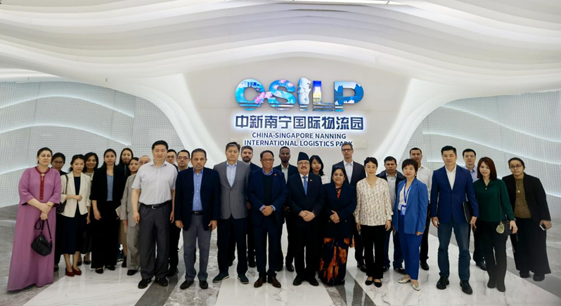 在中新物流園,使節(jié)團(tuán)通過參觀展廳、聽取介紹、互動交流等方式詳細(xì)了解園區(qū)的發(fā)展情況,對西部陸海新通道的戰(zhàn)略地位與廣西在其中的作用有了更深的認(rèn)識。中新物流園是廣西參與“一帶一路”及推進(jìn)中國與新加坡互聯(lián)互通、西部陸海新通道建設(shè)、海洋經(jīng)濟(jì)發(fā)展的重大項目之一,自2018年10月開工建設(shè)以來,園區(qū)發(fā)展迅猛,產(chǎn)業(yè)集聚效應(yīng)加速顯現(xiàn),現(xiàn)已引進(jìn)超30家世界500強(qiáng)和中國100強(qiáng)龍頭企業(yè)進(jìn)行合作,共同實施項目建設(shè)與運營。