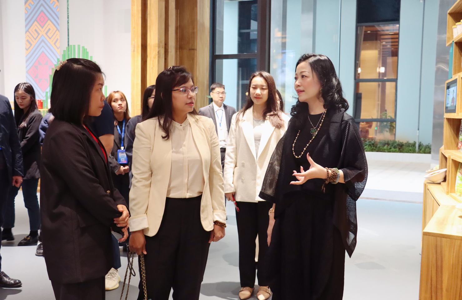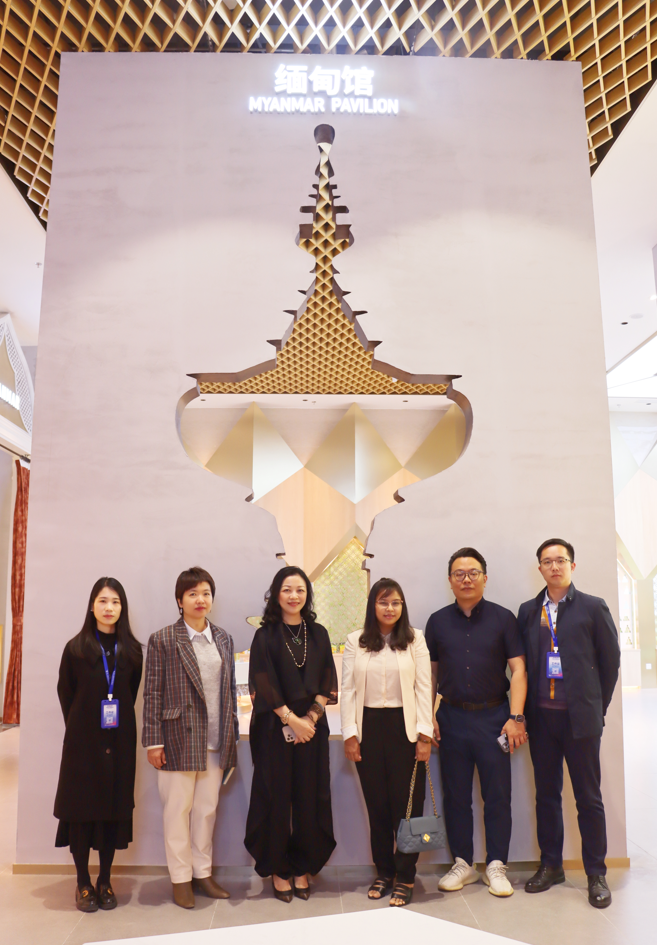 在參觀匯聚中心17個國家及地方特色展館過程中,趙海燕董事長介紹了匯聚中心展館如何通過人文設(shè)計理念烘托出各國當?shù)靥厣a(chǎn)品,以沉浸式的獨特商品貿(mào)易體驗促進交易。作為匯聚中心精心打造的國家主題展館,緬甸館以該國傳統(tǒng)特色文化為基調(diào),巧妙融合本地風土人情元素打造的“金色緬甸”效果,贏得了高凱玨參贊的認可。她表示緬甸館不僅設(shè)計別出心裁,而且能夠在一定的空間里盡可能地將緬甸多元文化與特色產(chǎn)品展示出來,可見項目策劃人所費的心思不一般。