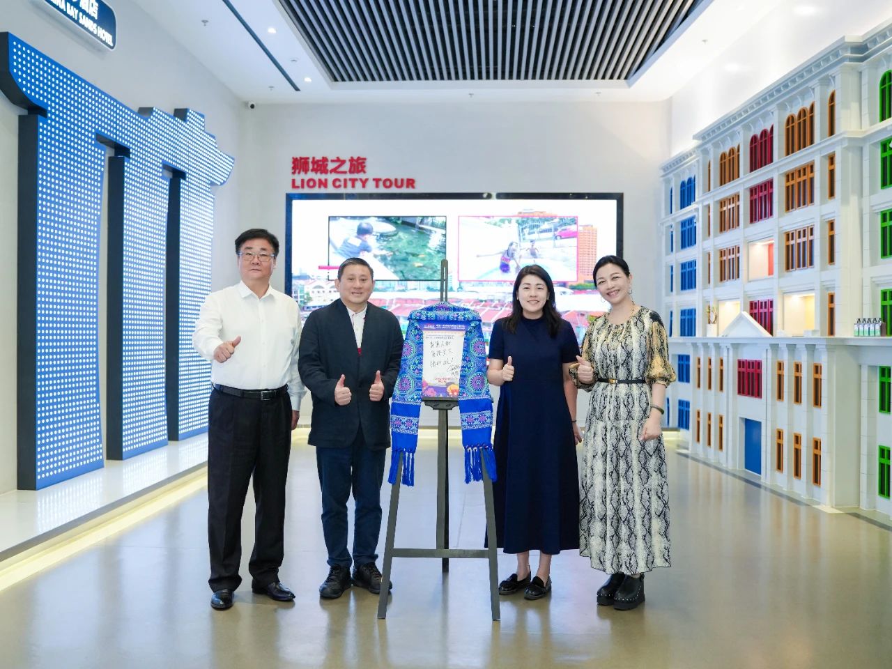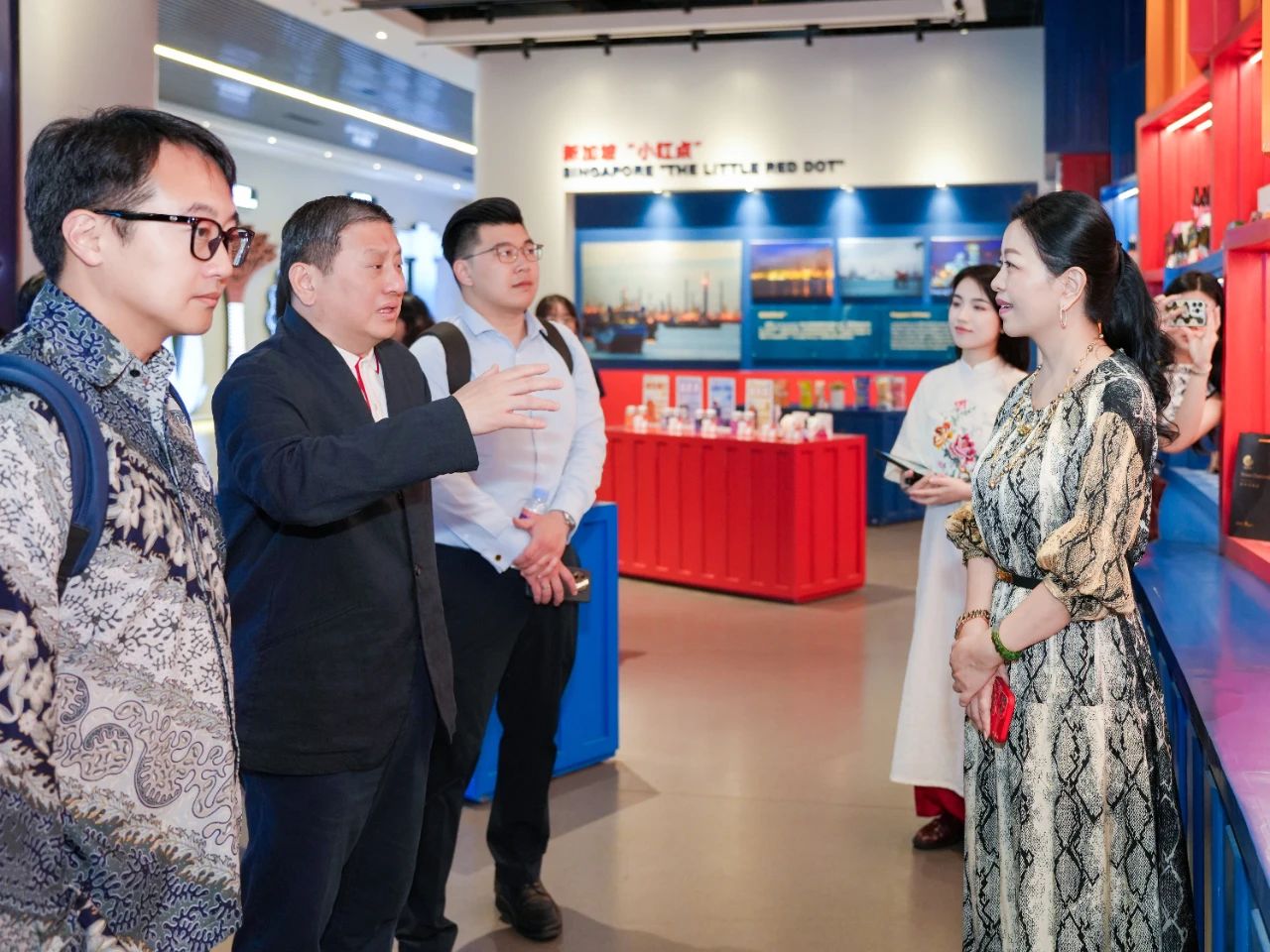 步入?yún)R聚中心,陳海泉大使便被新加坡展館門口的魚尾獅所吸引,特意駐足拍攝。進(jìn)入展館后,考察組沉浸式體驗(yàn)了璀璨星空走廊、垂直綠化的花園城市與組屋街區(qū)等場景,紛紛表示很開心能在廣西看到一個(gè)多維度呈現(xiàn)“獅城”獨(dú)特風(fēng)貌的地方,漫步其中恍若回到新加坡,倍感親切。同時(shí),考察組充分認(rèn)可了匯聚中心線上線下相結(jié)合的創(chuàng)新理念,并就未來在經(jīng)貿(mào)、物流等領(lǐng)域的合作與匯聚中心團(tuán)隊(duì)進(jìn)行了交流并達(dá)成共識(shí)。