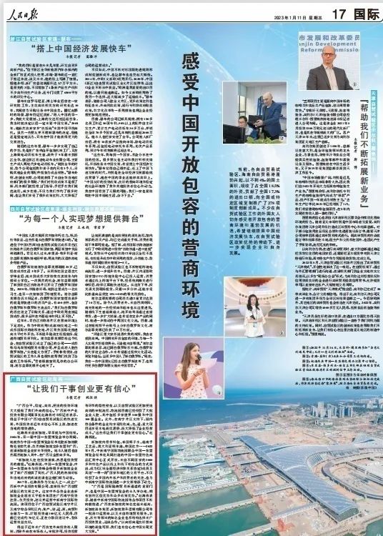 1月11日,《人民日報》第17版刊登《感受中國開放包容的營商環(huán)境》的報道。得益于中國(廣西)自由貿(mào)易試驗(yàn)區(qū)的快速發(fā)展,外國投資者切身感受著開放包容的營商環(huán)境和蓬勃發(fā)展的機(jī)遇,加速在當(dāng)?shù)氐脑鲑Y進(jìn)資。其中采訪了廣西新中產(chǎn)業(yè)投資有限公司董事長趙海燕,相關(guān)報道摘錄如下: